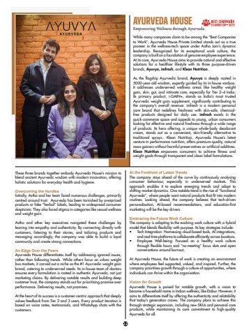 22 AYURVEDA HOUSEEmpowering Wellness through AyurvedaWhile many companies claim to be among the %u201cBest Companies to Work%u201d, Ayurveda House Private Limited stands out as a true pioneer in the wellness-tech space under Astha Jain%u2019s dynamic leadership. Recognized for its exceptional work culture, the company is built on a foundation of genuine employee experience. At its core, Ayurveda House aims to provide natural and effective solutions for a healthier lifestyle with its three purpose-driven brands, Ayuvya, imfresh, and Klean Nutrition. As the flagship Ayurvedic brand, Ayuvya is deeply rooted in 5000-year-old wisdom, expertly guided by its in-house vaidyas. It addresses underserved wellness areas like healthy weight gain, skin, gut, and intimate care, especially for Tier 2%u20134 India. Its primary product, i-GAIN+, stands as India%u2019s most trusted Ayurvedic weight gain supplement, significantly contributing to the company%u2019s overall revenue. imfresh is a modern personal care brand that redefines freshness with skin-safe, chemicalfree products designed for daily use. imfresh excels in the quick-commerce space and appeals to young, urban consumers looking for effective and natural freshness through a wide range of products. Its hero offering, a unique whole-body deodorant cream, stands out as a convenient, skin-friendly alternative to traditional sprays.. Klean Nutrition, Ayurveda House%u2019s latest venture in performance nutrition, offers premium-quality, natural mass gainers without harmful preservatives or artificial additives. Klean Nutrition empowers consumers to achieve fitness and weight goals through transparent and clean label formulations. These three brands together embody Ayurveda House%u2019s mission to blend ancient Ayurvedic wisdom with modern innovation, offering holistic solutions for everyday health and hygiene. Overcoming the HurdlesInitially, Astha and her team faced numerous challenges, primarily centred around trust. Ayurveda has been tarnished by overpriced products or fake %u201cherbal%u201d labels, leading to widespread consumer skepticism. They also faced stigma in categories like sexual wellness and weight gain. Astha and other key executives navigated these challenges by leaning into empathy and authenticity. By connecting directly with customers, listening to their stories, and tailoring products and messaging accordingly, the company was able to build a loyal community and create strong connections. An Edge Over the Peers Ayurveda House differentiates itself by addressing ignored issues, rather than following trends. While others focus on urban weight loss markets, it carved out a niche as the #1 Ayurvedic weight gain brand, catering to underserved needs. Its in-house team of doctors ensures every formulation is rooted in authentic Ayurveda, not just marketing claims. By delivering notable results and building deep customer trust, the company stands out for prioritising promise over performance. Delivering results, not promises. At the heart of its success is a customer-centric approach that deeply values feedback from Tier 2 and 3 users. Every product iteration is based on voice notes, testimonials, and WhatsApp chats with the customers.At the Forefront of Latest Trends The company stays ahead of the curve by continuously analysing consumer behaviour, especially in underserved markets. This approach enables it to explore emerging trends and adapt to shifting market dynamics. One notable trend is the rise of %u201cfunctional Ayurveda%u201d, where people want natural products that fit into modern routines. Looking ahead, the company believes that tech-driven personalisation, AI-based recommendations, and education-first marketing will be the key drivers. Embracing the Future Work CultureThe company is adapting to the evolving work culture with a hybrid model that blends flexibility with purpose. Its key strategies include: %u2022 Tech Integration: Harnessing cloud-based tools, AI integrations, and real-time platforms to collaborate efficiently across locations. %u2022 Employee Well-being: Focused on a healthy work culture through flexible hours and %u201cno-meeting%u201d focus slots and open conversations around burnout, At Ayurveda House, the future of work is creating an environment where employees feel supported, valued, and inspired. Further, the company prioritises growth through a culture of opportunities, where individuals can thrive within the organisation. Vision for GrowthAyurveda House is poised for notable growth, with a vision to become a household name in Indian wellness, like Dabur. However, it aims to differentiate itself by offering the authenticity and relatability that today%u2019s generation craves. The company plans to achieve this through strategic expansion, including new SKUs and personal care products, while maintaining its core commitment to high-quality Ayurveda for all.