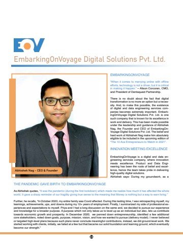 34 EMBARKINGONVOYAGE%u201cWhen it comes to marrying online with offline efforts, technology is not a driver, but it is critical in making it happen.%u201d %u2013 Alison Corcoran, CMO, and President of Dentaquest Partnership.There is no doubt about the fact that digital transformation is no more an option but a necessity. And, to make this possible, the existence of digital and data engineering services companies becomes extremely important. EmbarkingOnVoyage Digital Solutions Pvt. Ltd. is one such company that is known for its excellence in work and delivery. This has been made possible under the leadership and guidance of Abhishek Nag, the Founder and CEO of EmbarkingOnVoyage Digital Solutions Pvt. Ltd. The belief and hard work of Abhishek Nag make him absolutely eligible to be included in the upcoming edition of %u201cThe 10 Ace Entrepreneurs to Watch in 2021%u201d.INNOVATION MEETING EXCELLENCEEmbarkingOnVoyage is a digital and data engineering services company, where innovation meets excellence. Product and Data Engineering has been the roots of belief and excellence, hence the team takes pride in delivering high-quality digital solutions.Abhishek says- During my groundwork, as a EmbarkingOnVoyage Digital Solutions Pvt. Ltd.THE PANDEMIC GAVE BIRTH TO EMBARKINGONVOYAGEAs Abhishek quotes, %u201cIt was the pandemic (during the first lockdown) which made me realize how much it has affected the whole world. It gave a sharp reminder of our fragility giving true sense to the meaning that Money is nothing but a way to earn living.%u201dFurther, he recalls, %u201cIn October 2020, my entire family was Covid affected. During this testing time, I was retrospecting myself, my learnings, achievements, ups, and downs during my 12+ years of employment. Finally, I summarized my side of professional experiences and expectations to myself. Priya and I had a long discussion on the same and, we decided to pursue our experience and knowledge for a broader purpose. A purpose which not only takes us to level up as an individual but also, lets us contribute towards economic growth and prosperity. In December 2020, we penned down entrepreneurship, identified a few additional core stakeholders, noted down goals, purpose, mission, vision, and how we wanted to pursue (delivery model). I never believedor targeted high-level plans because such plans never conclude meaningful contributions, instead, we did ground-level work. We started working with clients, initially, we failed at a few but that became our solid foundation and learning ground, which eventually become our strength.%u201d Abhishek Nag - CEO & Founder