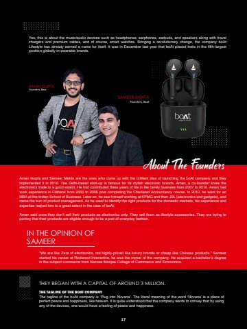 17Yes, this is about the music/audio devices such as headphones, earphones, earbuds, and speakers along with travel chargers and premium cables, and of course, smart watches. Bringing a revolutionary change, the company boAt Lifestyle has already earned a name for itself. It was in December last year that boAt placed India in the fifth-largest position globally in wearable brands. Aman Gupta and Sameer Mehta are the ones who came up with the brilliant idea of launching the boAt company and they implemented it in 2016. The Delhi-based start-up is famous for its stylish electronic brands. Aman, a co-founder knew the electronics trade to a good extent. He had contributed three years of his in the family business from 2007 to 2010. Aman had work experience in Citibank from 2003 to 2006 post completing the Chartered Accountancy course. In 2010, he went for an MBA at the Indian School of Business. Later on, he saw himself working at KPMG and then JBL (electronics and gadgets), and came the turn of product management. As he used to identify the right products for the domestic markets, his experience and expertise helped him to a great extent in the case of boAt.Aman said once they don%u2019t sell their products as electronics only. They sell them as lifestyle accessories. They are trying to portray that their products are eligible enough to be a part of everyday fashion.AMAN GUPTAFounders, BoatFounders, BoatSAMEER MEHTA%u201cWe are like Zara of electronics, not highly-priced like luxury brands or cheap like Chinese products.%u201d Sameer started his career at Redwood Interactive, he was the owner of the company. He acquired a bachelor%u2019s degree in the subject commerce from Narsee Monjee College of Commerce and Economics.About The FoundersTHEY BEGAN WITH A CAPITAL OF AROUND 3 MILLION.IN THE OPINION OF SAMEERTHE TAGLINE OF THE BOAT COMPANYThe tagline of the boAt company is %u2018Plug into Nirvana%u2019. The literal meaning of the word %u2018Nirvana%u2019 is a place of perfect peace and happiness, like heaven. It is quite understood that the company wants to convey that by using any of the devices, one would have a feeling of peace and happiness.17