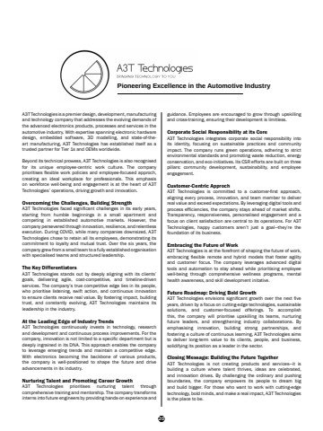 20 Pioneering Excellence in the Automotive IndustryA3T Technologies is a premier design, development, manufacturing and technology company that addresses the evolving demands of the advanced electronics products, processes and services in the automotive industry. With expertise spanning electronic hardware design, embedded software, 3D modelling, and state-of-theart manufacturing, A3T Technologies has established itself as a trusted partner for Tier 1s and OEMs worldwide. Beyond its technical prowess, A3T Technologies is also recognised for its unique employee-centric work culture. The company prioritises flexible work policies and employee-focused approch, creating an ideal workplace for professionals. This emphasis on workforce well-being and engagement is at the heart of A3T Technologies%u2019 operations, driving growth and innovation. Overcoming the Challenges, Building Strength A3T Technologies faced significant challenges in its early years, starting from humble beginnings in a small apartment and competing in established automotive markets. However, the company persevered through innovation, resilience, and relentless execution. During COVID, while many companies downsized, A3T Technologies chose to retain all its employees, demonstrating its commitment to loyalty and mutual trust. Over the six years, the company grew from a small team to a fully established organisation with specialised teams and structured leadership.The Key Differentiators A3T Technologies stands out by deeply aligning with its clients%u2019 goals, delivering agile, cost-competitive, and timeline-driven services. The company%u2019s true competitive edge lies in its people, who prioritise listening, swift action, and continuous innovation to ensure clients receive real value. By fostering impact, building trust, and constantly evolving, A3T Technologies maintains its leadership in the industry. At the Leading Edge of Industry Trends A3T Technologies continuously invests in technology, research and development and continuous process improvements. For the company, innovation is not limited to a specific department but is deeply ingrained in its DNA. This approach enables the company to leverage emerging trends and maintain a competitive edge. With electronics becoming the backbone of various products, the company is well-positioned to shape the future and drive advancements in its industry. Nurturing Talent and Promoting Career Growth A3T Technologies prioritises nurturing talent through comprehensive training and mentorship. The company transforms interns into future engineers by providing hands-on experience and guidance. Employees are encouraged to grow through upskilling and cross-training, ensuring their development is limitless.Corporate Social Responsibility at its CoreA3T Technologies integrates corporate social responsibility into its identity, focusing on sustainable practices and community impact. The company runs green operations, adhering to strict environmental standards and promoting waste reduction, energy conservation, and eco-initiatives. Its CSR efforts are built on three pillars: community development, sustainability, and employee engagement. Customer-Centric ApprochA3T Technologies is committed to a customer-first approach, aligning every process, innovation, and team member to deliver real value and exceed expectations. By leveraging digital tools and process efficiencies, the company stays ahead of market shifts. Transparency, responsiveness, personalised engagement and a focus on client satisfaction are central to its operations. For A3T Technologies, happy customers aren%u2019t just a goal%u2014they%u2019re the foundation of its business.Embracing the Future of Work A3T Technologies is at the forefront of shaping the future of work, embracing flexible remote and hybrid models that foster agility and customer focus. The company leverages advanced digital tools and automation to stay ahead while prioritising employee well-being through comprehensive wellness programs, mental health awareness, and skill development initative. Future Roadmap: Driving Bold GrowthA3T Technologies envisions significant growth over the next five years, driven by a focus on cutting-edge technologies, sustainable solutions, and customer-focused offerings. To accomplish this, the company will prioritise upskilling its teams, nurturing future leaders, and strengthening industry collaborations. By emphasising innovation, building strong partnerships, and fostering a culture of continuous learning, A3T Technologies aims to deliver long-term value to its clients, people, and business, solidifying its position as a leader in the sector. Closing Message: Building the Future Together A3T Technologies is not creating products and services%u2014it is building a culture where talent thrives, ideas are celebrated, and innovation drives. By challenging the ordinary and pushing boundaries, the company empowers its people to dream big and build bigger. For those who want to work with cutting-edge technology, bold minds, and make a real impact, A3T Technologies is the place to be.