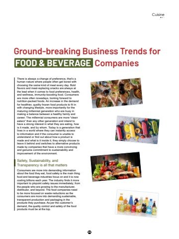 26 FOOD & BEVERAGE CompaniesGround-breaking Business Trends forThere is always a change of preference, that%u2019s a human nature where people often get bored with choosing the same kind of meal every day. Bold flavors and meal-replacing snacks are always at the lead when it comes to food preferences, health, and wellness, immunity-boosting food. Consumers are more often nowadays, looking forward to nutrition-packed foods. An increase in the demand for healthier, quality frozen food products to fit in with changing lifestyle, more importantly for the maturing millennial generation who are busy in making a balance between a healthy family and career. The millennial consumers are more %u201cclean eaters%u201d than any other generation and intend to have a strong interest in what they are eating, how is it made, and by whom. Today is a generation that lives in a world where they can instantly access to information and if the consumer is unable to understand or find out about how a product is made and what is it inside it, they simply choose to leave it behind and switches to alternative products made by companies that have a more convincing and genuine commitment to sustainability and improvement of the environment.Safety, Sustainability, and Transparency is all that mattersConsumers are more into demanding information about the food they eat, food safety is the main thing food and beverage industries focus on and it is now costing billions each year. The industry finds it more important to pinpoint safety issues immediately; from the people who are growing to the manufacturer, distributor, and beyond. The food companies need to be more focused on waste reductions as the consumers are more into demanding sustainable, transparent production and packaging in the products they purchase. As per the customer%u2019s demand, the quality control and safety of the food products must be at the top.Cuisine26