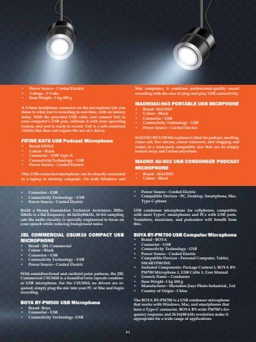 31%u2022 Power Source - Corded Electric%u2022 Voltage - 5 Volts%u2022 Item Weight - 1 kg 450 gA 3.5mm headphone connector on the microphone lets you listen to what you%u2019re recording in real-time, with no latency delay. With the provided USB cable, just connect Yeti to your computer%u2019s USB port, calibrate it with your operating system, and you%u2019re ready to record. Yeti is a self-contained vehicle that does not require the use of a driver.FIFINE K678 USB Podcast Microphone%u2022 Brand FIFINE%u2022 Colour - Black%u2022 Connector - USB Type-A%u2022 ConnectivityTechnology - USB%u2022 Power Source - Corded ElectricThis USB-connected microphone can be directly connected to a laptop or desktop computer. On both Windows and Mac computers, it combines professional-quality sound recording with the ease of plug-and-play USB connectivity.MAONOAU-903 PORTABLE USB MICRPHONE%u2022 Brand- MAONO%u2022 Colour - Black%u2022 Connector - USB%u2022 Connectivity Technology - USB%u2022 Power Source - Corded ElectricMAONO 903 USB Microphone is ideal for podcast, meeting, video call, live stream, casual voiceover, and vlogging and comes in a back-pack compatible size that can be simply tucked away and carried anywhere.MAONO AU-902 USB CONDENSER PODCAST MICROPHONE%u2022 Brand - MAONO%u2022 Colour - Black%u2022 Connector - USB%u2022 Connectivity Technology - USB%u2022 Power Source - Corded ElectricBuild a Strong Foundation Technical Assistance: 20Hz20kHz is a flat frequency. 44.1kHz/48kHz, 16-bit sampling rate the audio circuitry is specially engineered to focus on your speech while reducing background noise.JBL COMMERCIAL CSUM10 COMPACT USB MICROPHONE%u2022 Brand - JBL Commercial%u2022 Colour - Black%u2022 Connector - USB%u2022 Connectivity Technology - USB%u2022 Power Source - Corded ElectricWith omnidirectional and cardioid polar patterns, the JBL Commercial CSUM10 is a beautiful twin capsule condenser USB microphone. For the CSUM10, no drivers are required; simply plug the mic into your PC or Mac and begin recording.BOYA BY-PM500 USB Microphone%u2022 Brand- Boya%u2022 Connector - USB%u2022 Connectivity Technology- USB%u2022 Power Source - Corded Electric%u2022 Compatible Devices - PC, Desktop, Smartphone, Mac, Type C-phoneUSB condenser microphone for cellphones, compatible with most Type-C smartphones and PCs with USB ports. Youtubers, musicians, and podcasters will benefit from this.BOYA BY-PM700 USB Computer Microphone%u2022 Brand - BOYA%u2022 Connector - USB%u2022 Connectivity Technology - USB%u2022 Power Source - Corded Electric%u2022 Compatible Devices - Personal Computer, Tablet, SMARTPHONE%u2022 Included Components- Package Content 1, BOYA BYPM700 Microphone 1, USB Cable 1, User Manual%u2022 Generic Name %u2013 Condenser%u2022 Item Weight -1 kg 100 g%u2022 Manufacturer - Shenzhen Jiayz Photo Industrial., Ltd%u2022 Country of Origin - ChinaThe BOYA BY-PM700 is a USB condenser microphone that works with Windows, Mac, and smartphones that have a Type-C connector. BOYA BY-wide PM700%u2019s frequency response and 24 bit/48 kHz resolution make it appropriate for a wide range of applications.31