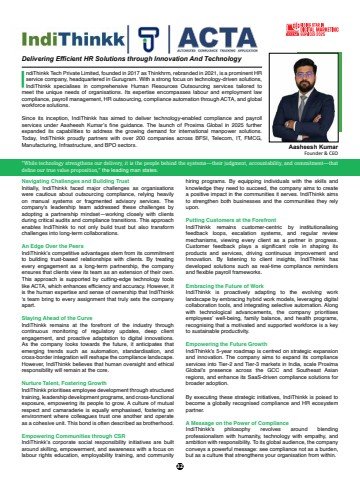 32 Delivering Efficient HR Solutions through Innovation And Technology IndiThinkk Tech Private Limited, founded in 2017 as Thinkhrm, rebranded in 2021, is a prominent HR service company, headquartered in Gurugram. With a strong focus on technology-driven solutions, IndiThinkk specialises in comprehensive Human Resources Outsourcing services tailored to meet the unique needs of organisations. Its expertise encompasses labour and employment law compliance, payroll management, HR outsourcing, compliance automation through ACTA, and global workforce solutions.Since its inception, IndiThinkk has aimed to deliver technology-enabled compliance and payroll services under Aasheesh Kumar%u2019s fine guidance. The launch of Proxima Global in 2025 further expanded its capabilities to address the growing demand for international manpower solutions. Today, IndiThinkk proudly partners with over 200 companies across BFSI, Telecom, IT, FMCG, Manufacturing, Infrastructure, and BPO sectors.%u201cWhile technology strengthens our delivery, it is the people behind the systems%u2014their judgment, accountability, and commitment%u2014that define our true value proposition,%u201d the leading man states. Navigating Challenges and Building Trust Initially, IndiThinkk faced major challenges as organisations were cautious about outsourcing compliance, relying heavily on manual systems or fragmented advisory services. The company%u2019s leadership team addressed these challenges by adopting a partnership mindset%u2014working closely with clients during critical audits and compliance transitions. This approach enables IndiThinkk to not only build trust but also transform challenges into long-term collaborations.An Edge Over the PeersIndiThinkk%u2019s competitive advantages stem from its commitment to building trust-based relationships with clients. By treating every engagement as a long-term partnership, the company ensures that clients view its team as an extension of their own. This approach is supported by cutting-edge technology tools like ACTA, which enhances efficiency and accuracy. However, it is the human expertise and sense of ownership that IndiThinkk %u2018s team bring to every assignment that truly sets the company apart. Staying Ahead of the Curve IndiThinkk remains at the forefront of the industry through continuous monitoring of regulatory updates, deep client engagement, and proactive adaptation to digital innovations. As the company looks towards the future, it anticipates that emerging trends such as automation, standardisation, and cross-border integration will reshape the compliance landscape. However, IndiThinkk believes that human oversight and ethical responsibility will remain at the core. Nurture Talent, Fostering Growth IndiThinkk prioritises employee development through structured training, leadership development programs, and cross-functional exposure, empowering its people to grow. A culture of mutual respect and camaraderie is equally emphasised, fostering an environment where colleagues trust one another and operate as a cohesive unit. This bond is often described as brotherhood.Empowering Communities through CSR IndiThinkk%u2019s corporate social responsibility initiatives are built around skilling, empowerment, and awareness with a focus on labour rights education, employability training, and community hiring programs. By equipping individuals with the skills and knowledge they need to succeed, the company aims to create a positive impact in the communities it serves. IndiThinkk aims to strengthen both businesses and the communities they rely upon.Putting Customers at the Forefront IndiThinkk remains customer-centric by institutionalising feedback loops, escalation systems, and regular review mechanisms, viewing every client as a partner in progress. Customer feedback plays a significant role in shaping its products and services, driving continuous improvement and Innovation. By listening to client insights, IndiThinkk has developed solutions such as real-time compliance reminders and flexible payroll frameworks. Embracing the Future of Work IndiThinkk is proactively adapting to the evolving work landscape by embracing hybrid work models, leveraging digital collaboration tools, and integrating selective automation. Along with technological advancements, the company prioritises employees%u2019 well-being, family balance, and health programs, recognising that a motivated and supported workforce is a key to sustainable productivity.Empowering the Future Growth IndiThinkk%u2019s 5-year roadmap is centred on strategic expansion and innovation. The company aims to expand its compliance services into Tier-2 and Tier-3 markets in India, scale Proxima Global%u2019s presence across the GCC and Southeast Asian regions, and enhance its SaaS-driven compliance solutions for broader adoption.By executing these strategic initiatives, IndiThinkk is poised to become a globally recognised compliance and HR ecosystem partner. A Message on the Power of Compliance IndiThinkk%u2019s philosophy revolves around blending professionalism with humanity, technology with empathy, and ambition with responsibility. To its global audience, the company conveys a powerful message: see compliance not as a burden, but as a culture that strengthens your organisation from within.Aasheesh KumarFounder & CEO