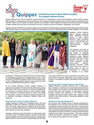 44 Unleashing Cross-Cultural Market Insights The Quipper Research StoryQuipper Research Pvt Ltd is an innovative market research firm, specialising in cross-cultural qualitative market research studies. With expertise in understanding customer preferences, the company introduces foreign brands to Indian markets and deciphers local customer needs. Its core mission is to deliver superior and meaningful market insights that empower international brands to navigate complex markets across the Indian subcontinent and Asia, including countries like Pakistan, Bangladesh, and Vietnam.Quipper Research%u2019s USP lies in its extensive experience working with international teams and global brands targeting the Indian market. The company excels in providing cultural insights and perspectives crucial for understanding diverse Indian audiences. As a premier qualitative market research agency, Quipper Research offers customised projects tailored to each client%u2019s distinctive needs, leveraging a blend of methodologies and cultural context to provide multi-dimensional market intelligence. The company%u2019s core vision is to predict as well as always stay abreast of changing behavioural and attitudinal sentiments across different population segments. Quipper Research has built a solid market reputation through word-of-mouth referrals, delivering top-notch, timely projects that have earned a steady stream of work. Its commitment to excellence is reflected in its notable recognitions, including the Aditya Birla Group%u2019s Eureka Awards for outstanding contribution by a strategic partner in 2017. It also received the ESOMAR Excellence Award for Best Global Paper in 2012. Additionally, Quipper Research was awarded the Best Paper at the AQR-QRCA Conference in Dublin.As the market landscape evolves, Quipper Research is exploring the potential of AI tools while also finding the growing demand for face-to-face research and personal engagement. As marketers are actively looking to seek valuable insights from consumers, the company aspires to remain a key player in the industry. It aims to expand its presence beyond India by delivering meaningful connections between brands and audiences. Entrepreneurial Journey of Quipper Research Quipper Research, founded by Pia M%u00f8llback-Verbic and Piyul Mukherjee in 2009, has undergone a significant transformation. From its humble beginning as a traditional brick-and-mortar setup, the company has evolved into a virtual model, empowering team members to work from anywhere. Currently, employees have the freedom to choose their most productive hours. This flexible approach requires self-discipline and accountability, with team members relying on meetings and digital mediums to stay connected. Quipper Research has made a conscious decision not to grow beyond the current team size, which allows for optimal collaboration and productivity, driving success in its objective to deliver high-quality market research insights. Nurturing a Culture of Collaboration and Excellence Quipper Research prioritises teamwork and a collaborative spirit, fostering a seamless work environment where the team works together across projects. The flat organisational structure ensures that every team member is well-versed in diverse business aspects, from beginning to end. While individual strengths and interests guide specific roles, everyone is fully attuned to the entire process of executing qualitative market research studies. Guidance for Aspiring Entrepreneurs Pia and Piyul offer valuable advice to aspiring entrepreneurs: be prepared to put in immense hard work with no fixed timeline, as building a successful venture can take years. They also warn against taking venture capital funding and suggest that powerful work can attract the right funding itself. Finally, entrepreneurs are responsible only to their conscience, focusing on the importance of staying true to their vision and values. This piece of advice reflects the founders%u2019 commitment to integrity, self-motivation and a passion-driven approach to the company.