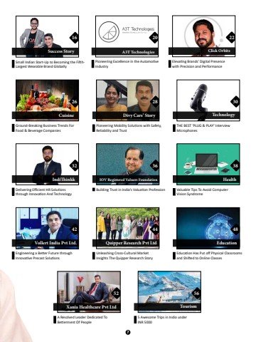 7Cuisine26Ground-Breaking Business Trends ForFood & Beverage CompaniesSuccess Story16Small Indian Start-Up to Becoming the FifthLargest Wearable Brand GloballyIndiThinkk32Delivering Efficient HR Solutions through Innovation And TechnologyVollert India Pvt Ltd.42Engineering a Better Future through Innovative Precast SolutionsXania Healthcare Pvt Ltd52A Resolved Leader Dedicated To Betterment Of PeopleTourism565 Awesome Trips in India under INR 5000Divy Cars%u2019 Story28Pioneering Mobility Solutions with Safety, Reliability and TrustIOV Registered Valuers Foundation36Building Trust in India%u2019s Valuation ProfessionQuipper Research Pvt Ltd44Unleashing Cross-Cultural Market Insights The Quipper Research StoryA3T Technologies20Pioneering Excellence in the Automotive IndustryTechnology30THE BEST %u2018PLUG & PLAY%u2019 Interview MicrophonesHealth38Valuable Tips To Avoid Computer Vision SyndromeEducation48Education Has Put off Physical Classrooms and Shifted to Online Classes22Elevating Brands%u2019 Digital Presence with Precision and PerformanceClick Orbits